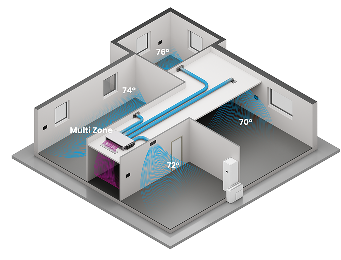 The unit is equipped with an independent DC inverter driven centrifugal fan for each zone resulting in low power consumption and better control.